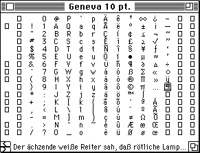 Wenn Sie etwas länger auf einen einzelnen Buchstaben drücken, so erhalten Sie den Buchstaben bei einer Größe von ca. 144 point. Er wird Anti-Alias dargestellt mit seiner ASCII-Zahl in Dezimal- und in Hexadezimaldarstellung. Das Beispiel zeigt auch Leading, Ascent, Descent und die Zeichenbreite. Breiten größer als em-width werden rot dargestellt. Wenn Sie auf einen Buchstaben doppleklicken, so wird er in die Zwischenablage kopiert unter Beibehaltung der aktuellen Schrift, Größe und des Stiles. Das kann sich bei DingBats-Zeichensätzen als nützlich erweisen.