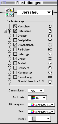 Man kann Dateien aus dem Finder oder aus Dateien finden und bestimmten anderen Programmen einfach auf dieses Fenster ziehen. Die Anzahl der dargestellten Voransichtsbilder pro Reihe ergibt sich aus der Fensterbreite und den gewählten Dimensionen im Einstellungsfeld Voransichten.