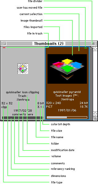 ] key down extends the selection to the nearest previously selected thumbnail. Dragging from between the thumbnails and the scroll bar to the left performs a rolling drag. Pressing an alphanumeric key selects the first file name beginning with that letter. Also, selecting an Image Window or Movie Window selects its corresponding thumbnail. The Animation Window, Media Info Window, Slide Show, and Tile Window will synchronize their contents to the primary selection. Additionally, the Selection menu provides a sub-menu for selecting multiple thumbnails. Of course Next Thumbnail and Previous Thumbnail, [
