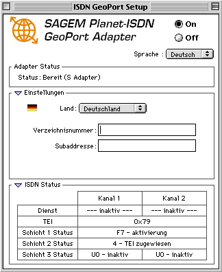 Zuerst muß wie bei der America Online-Konfiguration der Sagem Geoport Adapter richtig konfiguriert sein: