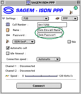 Im Kontrollfeld SAGEM ISDN PPP muß folgendes eingetragen werden: