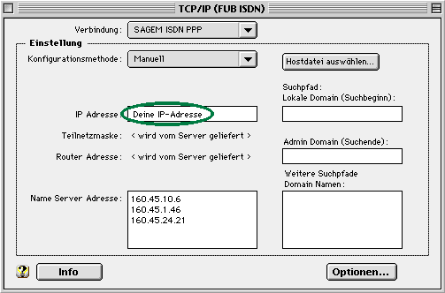 Die weiteren Eintragungen sind die gleichen wie bei Verbindungen mit MACPPP, FreePPP oder Open Transport PPP.