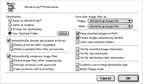 (Ich persönlich stelle die Prefernces von ShrinkWrap immer auf "Keep mounted Images in RAM" und "Mount Images as unlocked by default" immmer ab. Deshalb habe ich folgendes AppleScript geschrieben. Es setzt die Preferences wie oben angegenben. Öffnet die Image-Datei, die die RAM-Disk beinhaltet. Setzt die Preferences wieder in den alten Zustand zurück und startet Netscape.