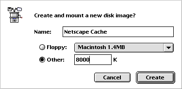 Ich habe der Image Datei, die ich "Netscape Cache" getauft habe, 8000 Kilobytes zugewiesen. Daraus werden übrigens aus unerfindlichen Gründen 9,5 Megabytes. Diese Datei wird erst einmal auf Ihrer Festplatte abgelegt( Sie erhält übrigens erst einmal den Namen "Untitled Image"; ein Änderung scheint ratsam). Sie sehen auch, daß auf Ihrem Desktop ein neues Symbol erschienen ist. Sie haben jetzt eine zusätzliche virtuelle Festplatte in der Größe von 9,5 MB. Sie können auf sie Dateien kopieren und sie von dort wieder löschen. Wie das funktioniert entnehmen Sie bitte der Dokumentation von ShrinkWrap(s. o.). Sollten Sie tatsächlich etwas darauf kopiert haben, so löschen Sie es jetzt bitte wieder und schieben Sie das Icon unser gerade eben erstellten Festplatte auf den Papierkorb. Wir müssen noch etwas an den Einstellungen von ShrinkWrap ändern.